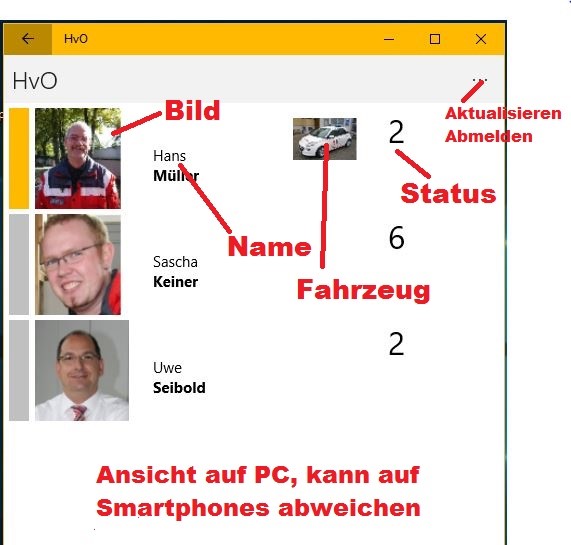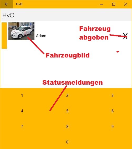 Innerhalb der HvO-Gruppe wird der entsprechende Status der jeweiligen Helfer an die anderen Mitglieder übermittelt. Durch Drücken des Fahrzeug-Symbols wird anderen Helfern angezeigt, dass man das im System angemeldete HvO-Einsatzfahrzeug momentan im Besitz hat (Bei mehreren Fahrzeugen durch langes Drücken mit Pop-Up-Untermenü).
